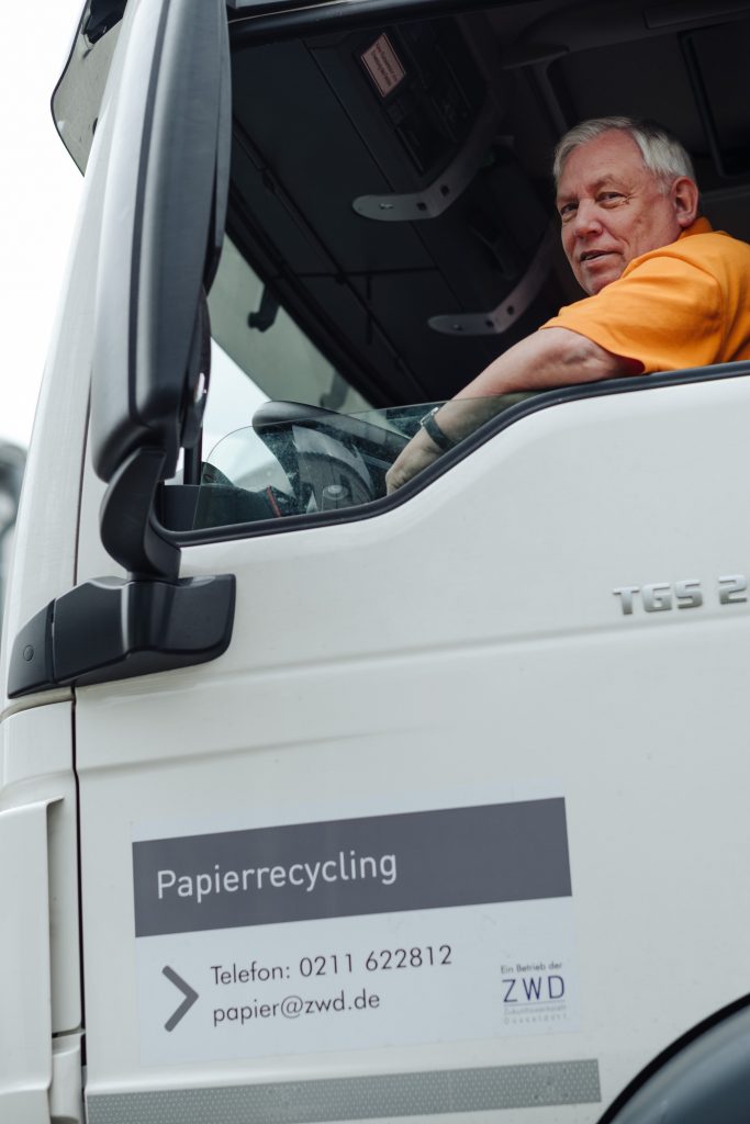 Wer beim ZWD-Betrieb Papierrecycling arbeitet, wird automatisch zum Frühaufsteher. Das Team ist täglich ab 6 Uhr startklar. Ankommen, umziehen, kurz die tägliche Planung besprechen und los geht’s auf die fünf Sammelfahrzeuge und hinaus in die morgendliche Stadt.