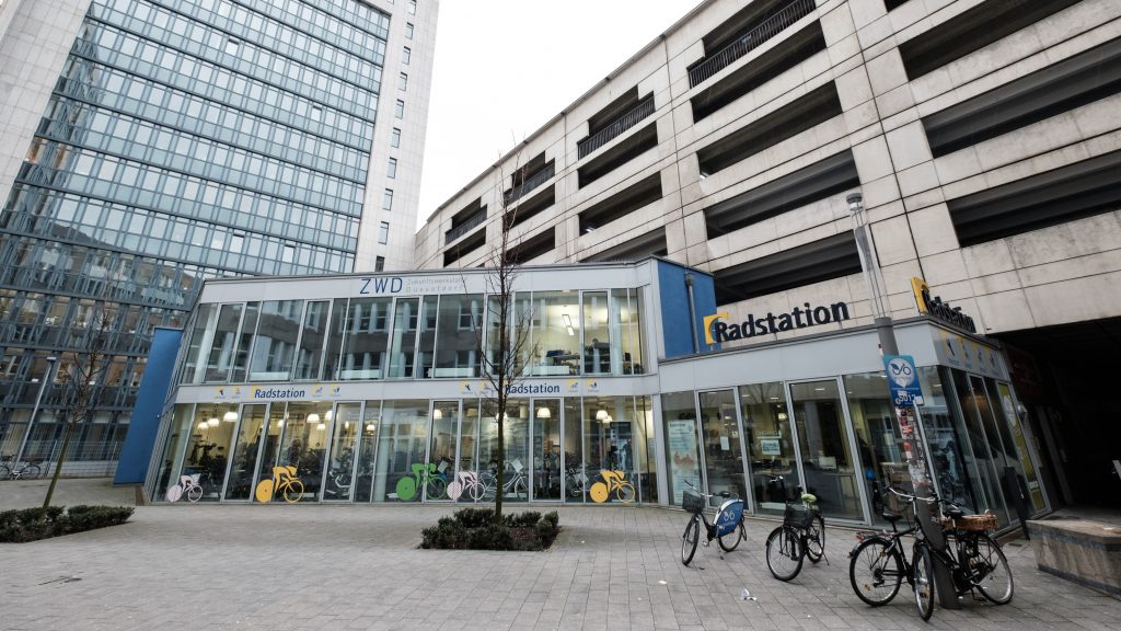 Die Radstation Düsseldorf am Hauptbahnhof mit Fahrradparkhaus, Werkstatt und Verleih.