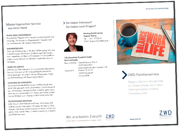 Beratung von insbesondere kleinen und mittleren Unternehmen (KMU) aus Düsseldorf und dem Kreis Mettmann zu allen Themen rund um Vereinbarkeit von Beruf und Familie, Recruiting von weiblichen Fachkräften, Einrichten von betrieblicher Kinderbetreuung und flexiblem Arbeiten. Der ZWD-Familienservice bietet zudem ein umfassendes kostengünstiges Komplett-Beratungsangebot für Unternehmen.